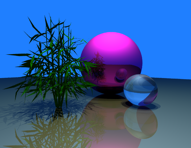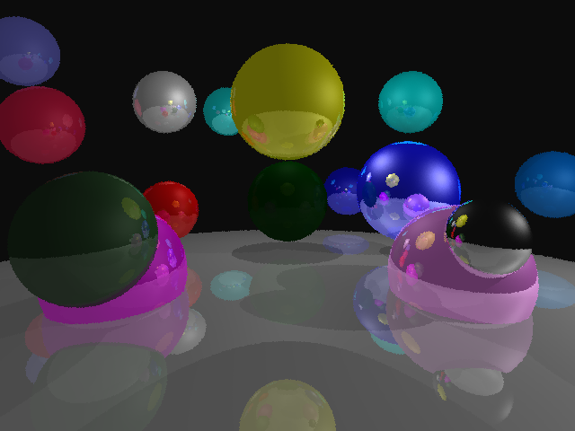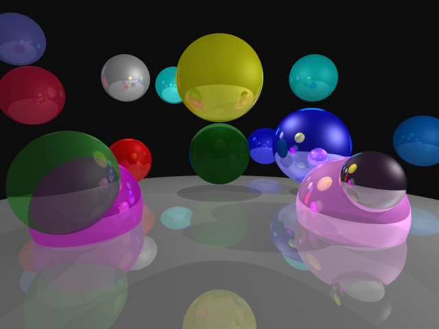 The result is pretty clear in the green sphere on the left. After I was satified with my refraction implemention, I worked on implementing triangles.